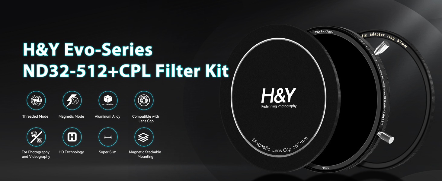 H&Y EVO MC HD ND32-512 +CPL è un kit filtro a ND variabile che può ridurre la luminosità da 5 f-stop a 9 f-stop e che combina anche un polarizzatore circolare.