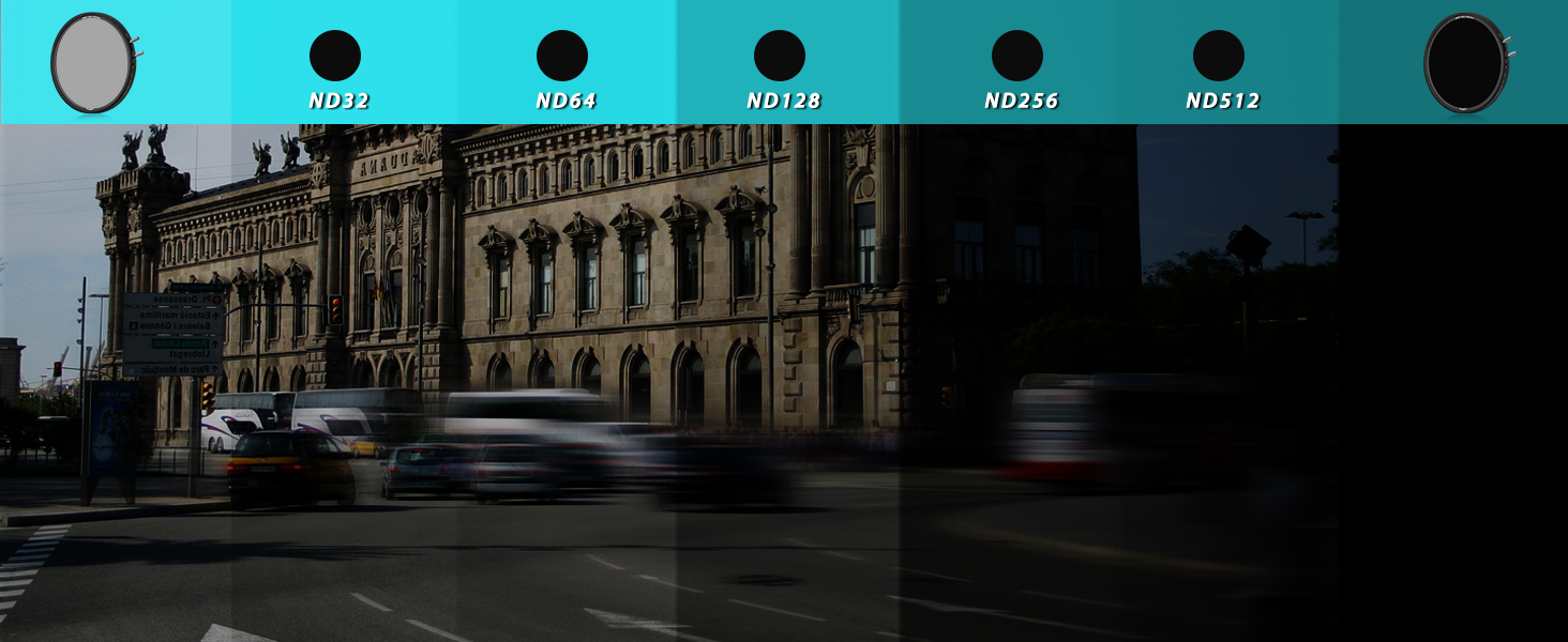 * Attenzione! Su ottiche grandangolari di lunghezza focale inferiore a 35mm si può verificare un effetto a X impostando valore ND 64 (riduzione 6 stop) o superiore; con queste focali si raccomanda di non superare il fattore ND32 / 5 stop.